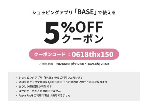 ショッピングアプリ「BASE」で使用できるクーポン配布中です。